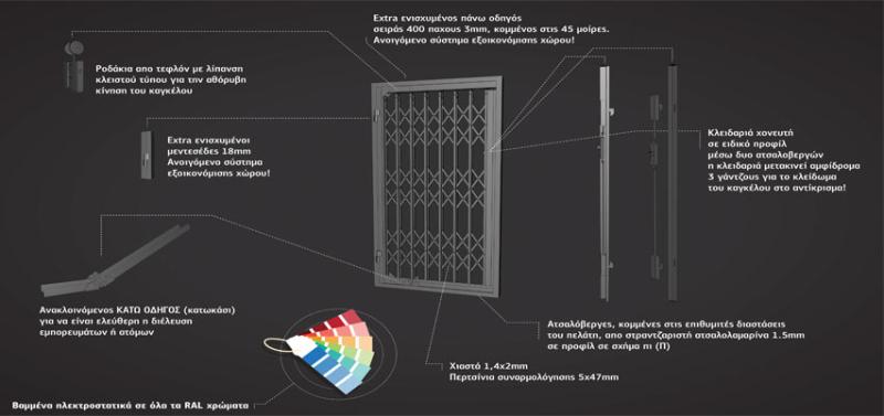 Ανώτατη αντιδιαρρηκτική προστασία Ευκολία χρήσης & ελάχιστη συντήρηση Ποικιλία χρωμάτων με ηλεκτροστατική βαφή Προσαρμογή σε κάθε διάσταση ανοίγματος